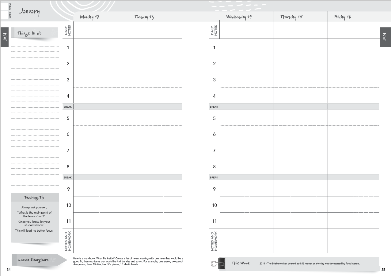 The innovative teachers' companion Primary Years edition (3-6) is your teachers’ diary to assist you with your daily, monthly and yearly planning with the following additional features: